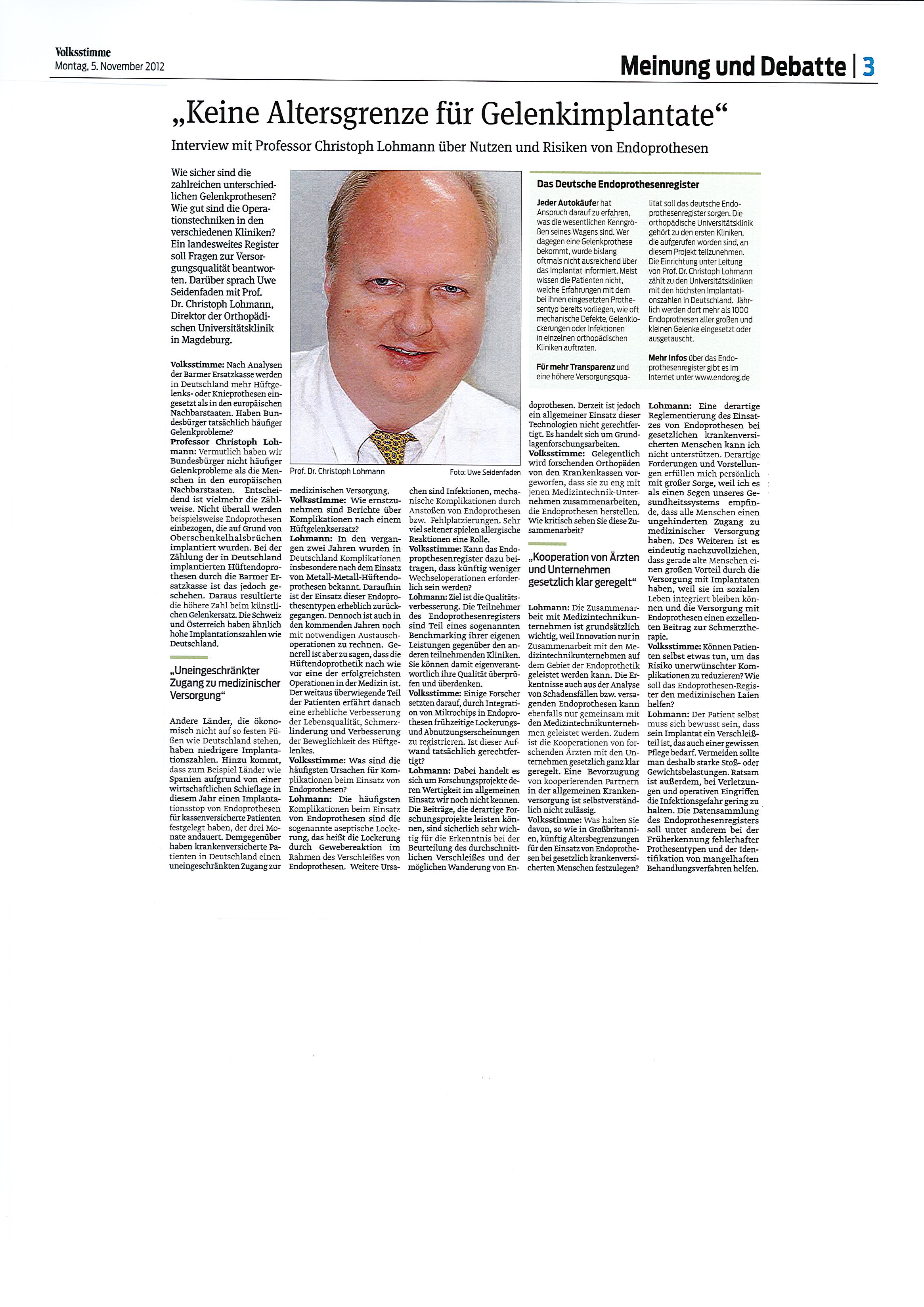 05.11.2012 "Keine Altersgrenze für Gelenkimplantate" Magdeburger Volksstimme