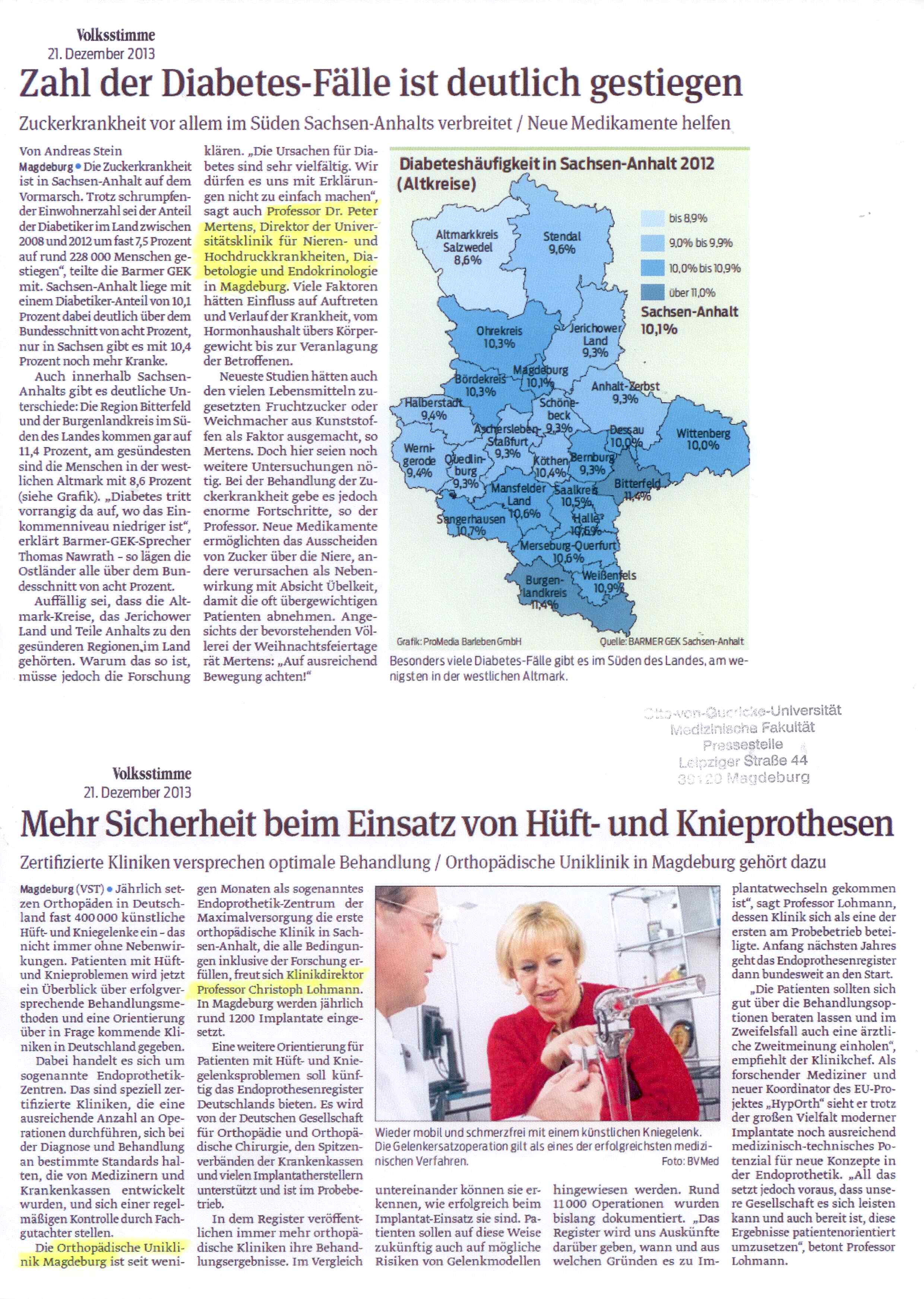 23.12.2013 "Mehr Sicherheit beim Einsatz von Hüft- und Knieprothesen" Magdeburger Volksstimme