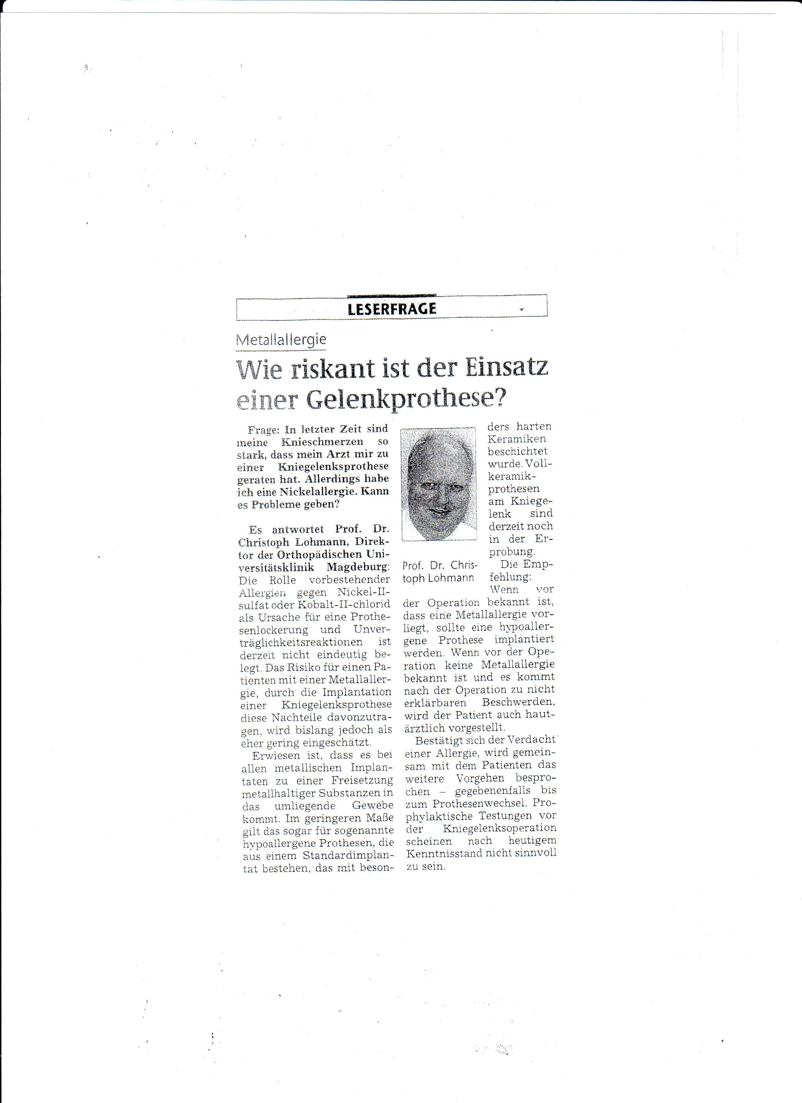 10.11.2010 "Wie riskant ist der Einsatz einer Gelenkprothese" Magdeburger Volksstimme